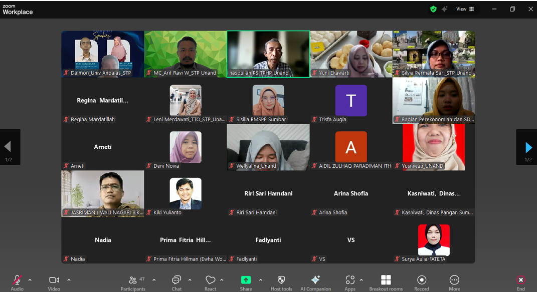 Webinar menghadirkan dua narasumber utama, yakni Dr. Ir. Hasbullah, M.S. dan Dr. Yuni Ekawarti, S.E., M.M., dengan moderator Daimon Syukri, S.Si, M.Si, Ph.D. dan Wellyalina, S.TP., M.P..