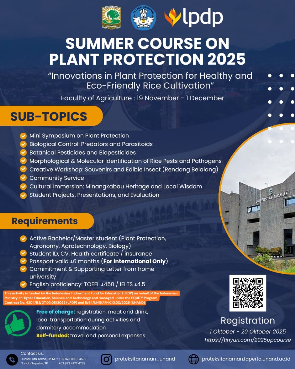 Padang, October 10, 2025 – Universitas Andalas (Unand), through its Faculty of Agriculture, is preparing to host an international Summer Course themed “Innovation in Plant Protection for Healthy and Environmentally Friendly Rice Cultivation.” The program, part of the EQUITY THE Impact Ranking initiative, is scheduled to take place from November 19 to December 2, 2025, and is currently in the process of participant recruitment and administrative preparation.